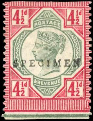 1892 4½d Jubilee Colour Trial (Line Perf 14). Very fine bottom marginal partially perforated colour trial on gummed, Crown watermarked paper. Head plate printed in grey-green and duty plate in carmine, optd "SPECIMEN" type 13. One toned spot, still an attractive example of this scarce trial in the issued colours. SG 206var.