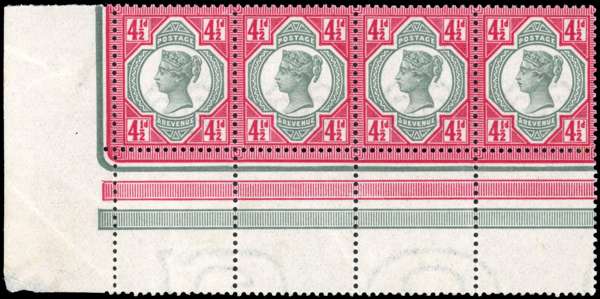 1887-1900 Jubilee 4½d green and deep bright carmine, unmounted mint left-hand interpanneau marginal strip of four (mounted in margin) with beautiful deep fresh colours. A wonderful multiple of this scarce shade. RPS Certificate (2023). SG 206a