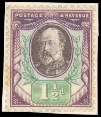 1901 KEVII 1½d composite ‘’paste-up'' essay of the Jubilee series, Series A essay with a lithographed three-quarter portrait of the King mounted on thick card. Small traces of peripheral tones. Still a most attractive and rare essay, believed to be one of only a handful of examples in private hands. SG 221var cat £11,000