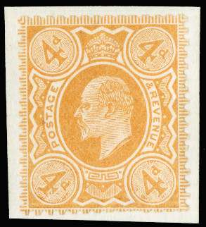 1909 4d colour trial in yellow-orange on Crown watermarked paper from the monocoloured plate, on small piece of white card. Some short perfs at top and foot, otherwise fine and rare, with only two or three examples of each colour in private hands. SG 240 var.