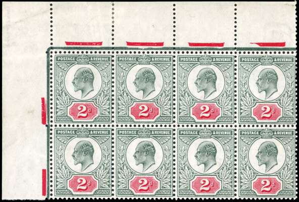 1902-10 2d grey green & scarlet on chalk-surfaced paper, upper left marginal block of eight showing R.1/1 variety "distorted value tablet" (Later state, plate D3), mint, unmounted o.g. (mounted in margin only). A very scarce positional block. Spec. M12(4)c, SG 228var.