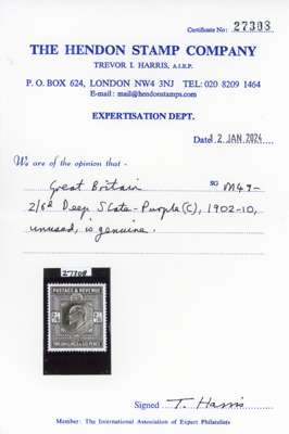1902-10 De La Rue 2s6d deep slate-purple, chalky paper, with large part o.g.; some slight rubbing as usual, lovely fresh colour. Hendon Stamp Company opinion (2024). SG 262 var