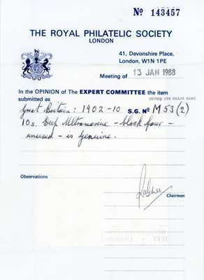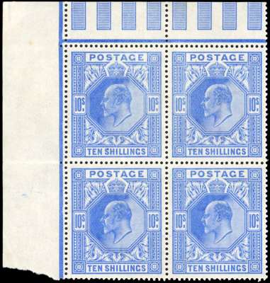 1902-10 10s deep ultramarine, mint unmounted o.g. upper left corner block of four. Superb with wonderful fresh appearance. RPS Certificate (1988). SG 265; Spec M53(2) cat £7,200+