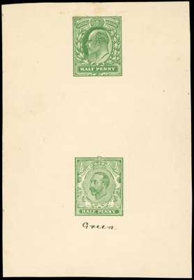 1911 ½d Green colour trials in Edwardian colours, very fine pair of se-tentant colour trials of the Edwardian design and proposed George V design (30mm spacing) printed on white wove ungummed paper endorsed in manuscript "Green" below the George V stamp. Some staining at the top, still a spectacular trial, unique in private hands. SG 218var, from £20,000.