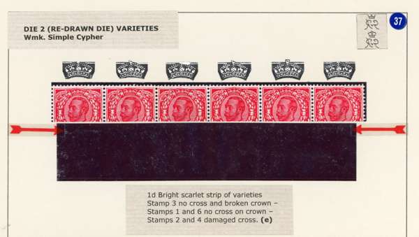 1912 watermark Simple Cypher, Die 2, 1d bright scarlet, mint left marginal strip of six, showing varieties on stamps 1, 3 and 6 ‘NO CROSS ON CROWN’ and stamps 3 and 4 ‘DAMAGED CROSS’; mounted on selvedge and right-hand stamp and rest unmounted. Fine. RPS Certificate (1995). SG 341 var, Spec N12(2)var