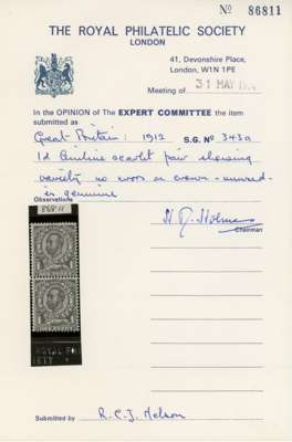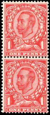 1912 wmk Crown, Die 2, 1d aniline scarlet, mint unmounted o.g. vertical pair, top stamp showing ‘NO CROSS ON CROWN’ variety. Very bright aniline reaction. Scarce and very fine. RPS Certificate (1974). SG 343a cat £2000+