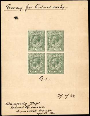 1912-24 9d olive-green colour trials, imperforate block of four printed in bronze-green on unwatermarked paper, unused o.g., mounted on thick card (95 x 123mm). Card endorsed in manuscript "Essay for Colour only" at top, "G.1., 27.7.22" and "Stamping Dept, Inland Revenue, Somerset House W.C.2" at foot. Extremely attractive and rare. SG 393a,var cat £28,000