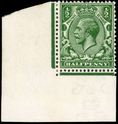 GB 1912-24 Royal Cypher ½d very deep green, mint unmounted o.g. left corner example