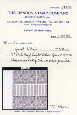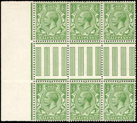 1912-24 Royal Cypher ½d bright yellow-green, mint unmounted o.g., left interpanneau-marginal block of six, in a pale very bright shade. Fine. Hendon Stamp Company opinion (2019). SG 351 var, Spec N14(11) var