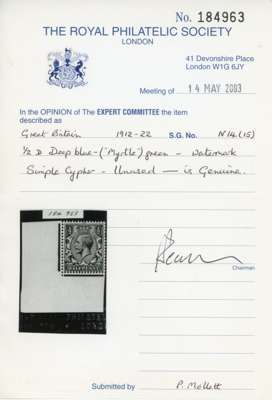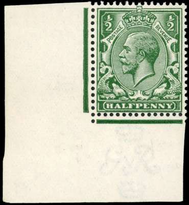 1912-24 Royal Cypher ½d deep blue-("Myrtle") green, mint unmounted o.g. left corner single. Very fine. RPS Certificate (2003). SG 356 var, Spec N14(15)