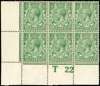 1912-24 Royal Cypher ½d pale cobalt-green, mint control T22 corner block of six, upper right pair o.g. otherwise unmounted. Minor offsetting and a small gum bend, otherwise fine. A scarce shade recorded by Alcock. Good colour. Hendon Stamp Company opinion (2023). SG 356 var. Spec N14(17) cat £100