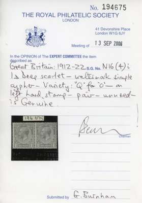 1912-24 Royal Cypher 1d deep scarlet, mint unmounted o.g., horizontal pair, left stamp with variety ‘Q’ for ‘O’ (control T22, R 4/11). Attractive deep colour. RPS Certificate (2006). SG 357ab var, Spec N16(4)i
