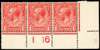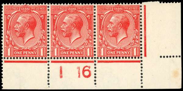 GB: 1912-24 1d deep vermilion, mint control I16 strip of three