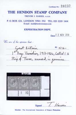 1912-24 Royal Cypher 1d deep vermilion, mint unmounted o.g. (central stamp very lightly mounted), lower right control I16 strip of three, lovely colour. Fine. Hendon Stamp Company opinion (2018). SG 358 var, Spec N16(7) var