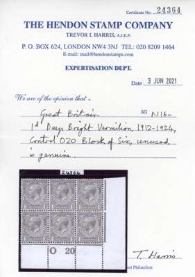 1912-24 Royal Cypher 1d deep bright vermilion, mint unmounted o.g. (top left stamp lightly mounted), lower right control O20 block of six, a couple of minor gum bends. Lovely colour of this rare shade documented by the RPS. Hendon Stamp Company opinion (2021). SG 358 var, Spec N16(7) var