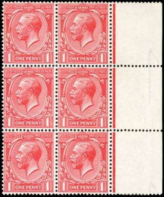 1912-24 Royal Cypher 1d bright rose red, mint unmounted o.g. right-marginal block of six with good colour. Very fine. Photocopy of Hendon Stamp Company opinion (2022) when in a block of thirty. SG 359 var, Spec N16(9) var