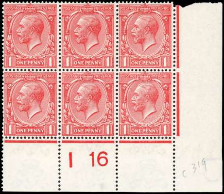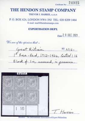 1912-24 Royal Cypher 1d rose-red, mint unmounted o.g. (central stamp mounted), lower right control I16 block of six, one perf missing at top right. Lovely colour of this scarce shade. Listed in Oliver and Vallencey. Good. Hendon Stamp Company opinion (2021). SG 359 var, Spec N16(9) var