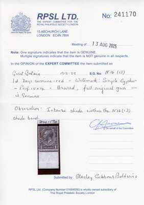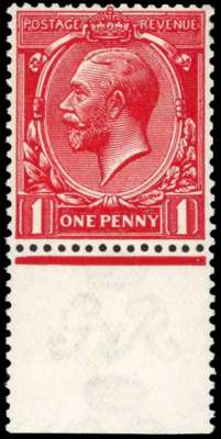 1912-24 Royal Cypher 1d intense bright scarlet, mint unmounted o.g. from the foot of the sheet with quite outstanding deep colour. RPS Certificate (2025). SG 360 var, Spec N16(13)