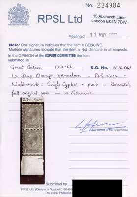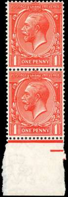 1912-24 Royal Cypher 1d deep orange-vermilion, mint unmounted o.g. vertical pair from the foot of the sheet with outstanding rich deep colour. RPS Certificate (2022). SG 358 var, Spec N16(16)