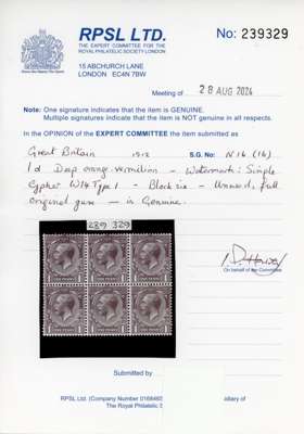 1912-24 Royal Cypher 1d deep orange-vermilion, mint unmounted o.g. block of six with outstanding “intense” colour. A rare and underrated shade, rarely seen in multiples. RPS Certificate (2024). SG 358 var, Spec N16(16)