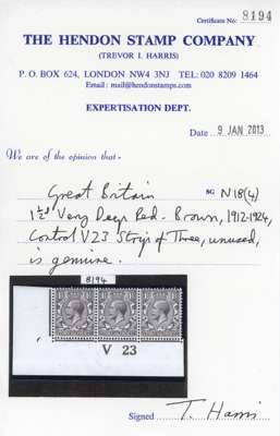 1912-24 Royal Cypher 1½d very deep red-brown, mint large part o.g. (central stamp unmounted) in a very rare control V23 strip of three with outstanding deep colour. Hendon Stamp Company opinion (2013). SG 362 var, N18(4)