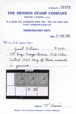 1912-24 Royal Cypher 1½d deep orange brown, mint unmounted o.g., control U23 strip of three, lovely intense colour. Very fine and most attractive. Hendon Stamp Company opinion. SG 364 var, Spec N18(15) var