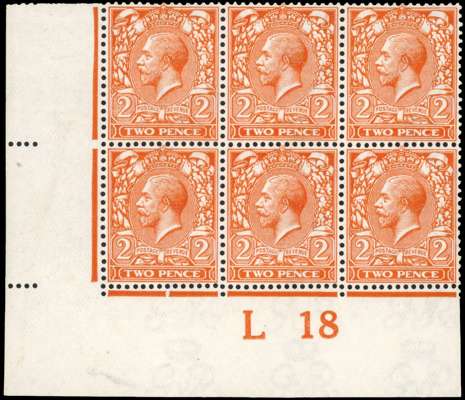 1912-24 Royal Cypher 2d deep reddish orange, mint large part to unmounted o.g. lower right control L18 block of six, (mounted on top right hand stamp and central stamp on lower row.) Good with attractive appearance. A scarce shade. RPS Certificate (2023). SG 367 var, N19(3)