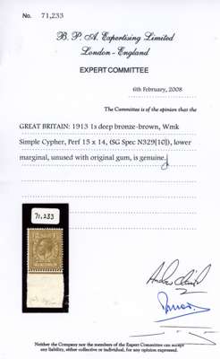 1912-24 Royal Cypher 1s deep bronze-brown, mint unmounted o.g. with outstanding deep colour. A rare and under-catalogued shade. BPA Certificate (2008). SG 396 var, Spec N32(10)