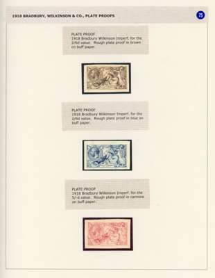 1918-19 Seahorses Waterlow three imperforate rough plate proofs on buff paper neatly arranged on an album page comprising 2s6d in brown and in indigo, and 5s in carmine. Fine. (3). SG 399 var, 401 var