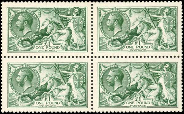 1913 £1 dull blue-green, mint unmounted o.g. well-centred block of four. Superb. SG 404 cat £15,200+