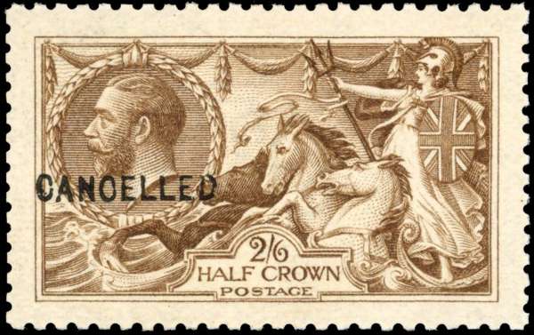 Great Britain 1915 DLR 2s6d yellow-brown, optd "CANCELLED", SG 406var