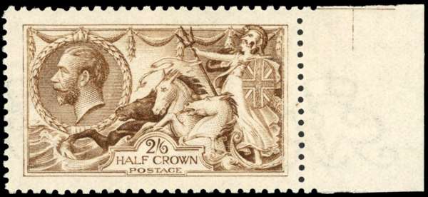1915-18 2s6d pale brown (worn plate), mint large part o.g. right hand marginal showing ‘ REVERSED WATERMARK’. Fine. SG 407wj cat £950