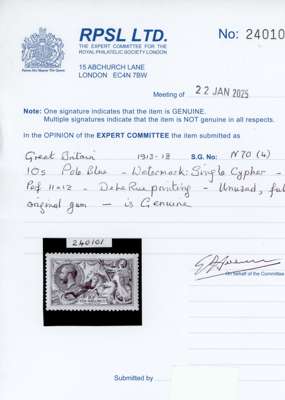 1915 10s pale blue, mint unmounted o.g. well centred with lovely colour. RPS Cert (2025). SG 413 cat £3500