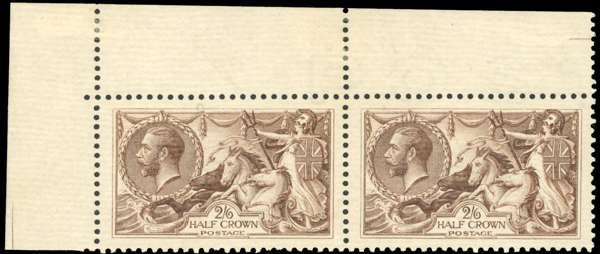1918-19 2s6d pale brown, unmounted mint (mounted in margin) top left corner horizontal pair on ribbed paper (clearly showing in the margin). Fresh appearance. SG 415a var