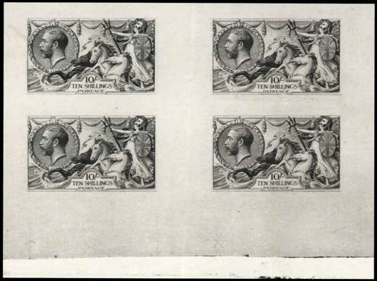 1929 10s "Seahorse" plate proof. Very fine and rare imperforate block of four printed in black on hard unwatermarked wove paper from a special curved plate of nine impressions. Most attractive. SG 417var cat £36,000+.