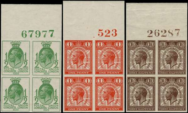 1929 PUC ½d to 1½d (watermark sideways) top sheet number marginal blocks of four, imperforate imprimaturs from the sideways coil printing with ‘BPMA’ h/s on reverse, mint unmounted o.g., very fine and rare. SG 434a/6a var