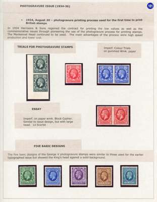 1934 Photogravure imperforate colour trials on gummed watermark paper selection neatly arranged on an album page including large head 1d in scarlet horizontal pair, ½d small head (as issued) in deep grey-green, lower marginal vertical pair, scarlet single, ultramarine horizontal pair and . Good to fine. (9 items)