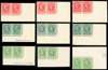 1934 1d, 1½d and 4d Photogravure colour trials. A superb set of eighteen corner marginal imperforate pairs each value printed in red, pearl green, emerald-green, royal blue, dull lilac and brown on gummed, unwatermarked ordinary paper. Each pair unmounted o.g. except the emerald-green pairs which have the usual streaky, patchy gum. A magnificent set which is virtually impossible to replicate. SG 440/445var