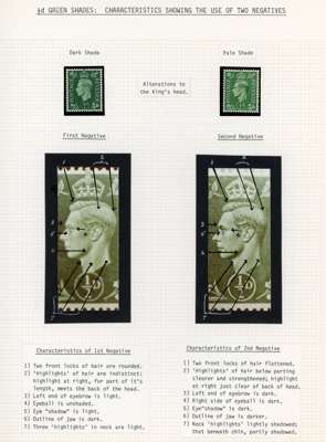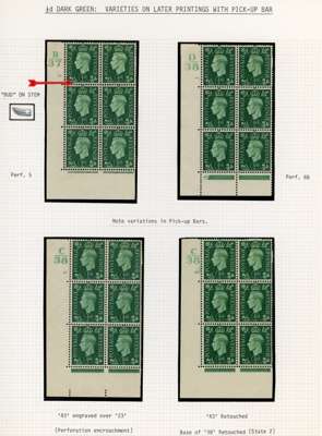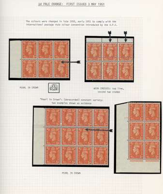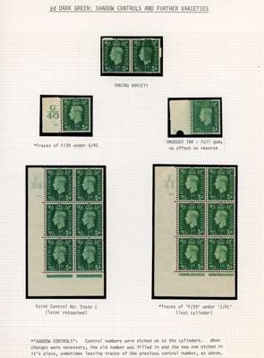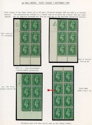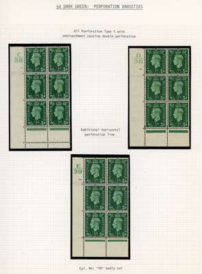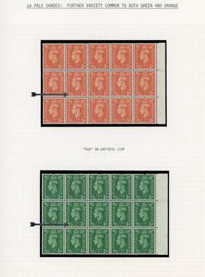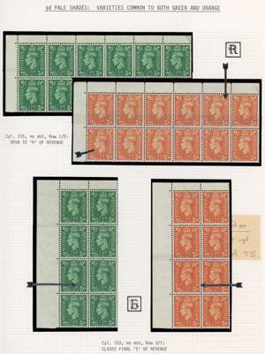 1937-52 ½d collection on leaves. ½d green with spur on ‘2’ block; pair, one unmounted with large ink splodge; unmounted single with ink smudged; various Cylinder blocks. The pale green and pale orange stamps each in blocks with spur to ‘R’ and closed ‘E’ varieties. SG 462, 485, 503.