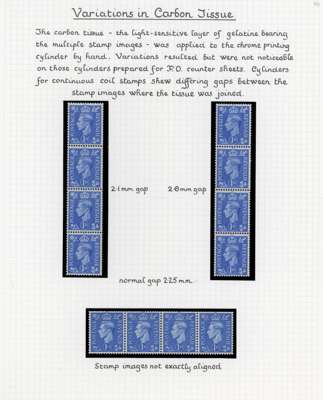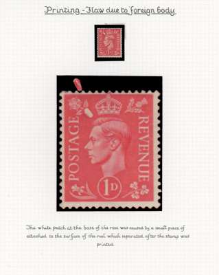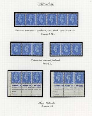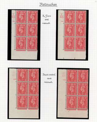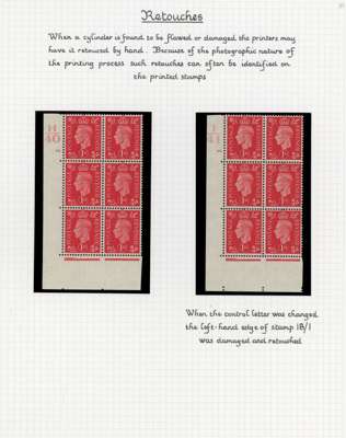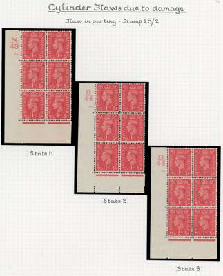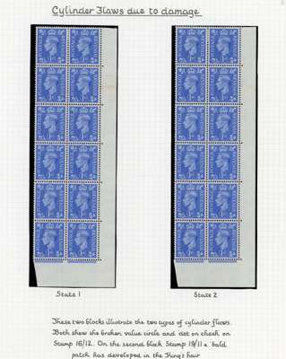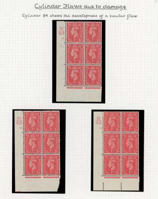1937-51 Cylinder varieties (178 stamps) on the 1d value, a small display entitled ‘Cylinder Flaws due to Damage". Includes faint controls, retouches to stamps and controls, flaws including 1d pale scarlet ’flaw in parting' (three states), 1d ultramarine broken circle and ‘Shorthand’ booklet panes with major retouches, etc.