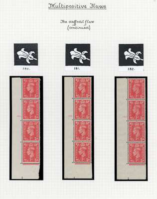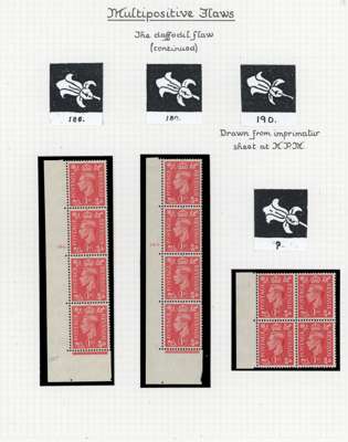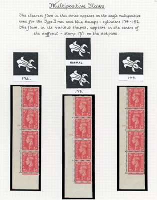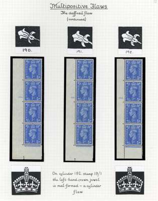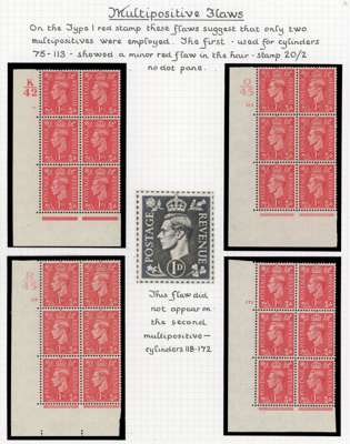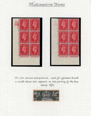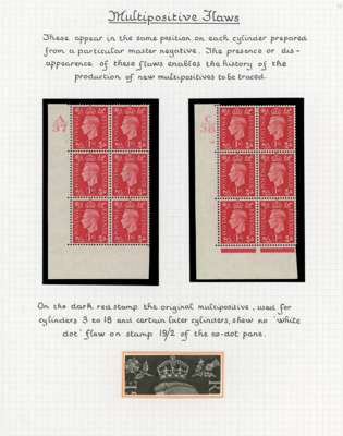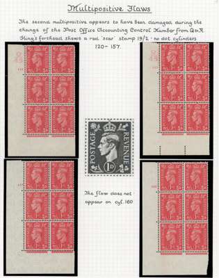1937-51 display pages with a demonstration of multipositive flaws on the 1d, o.g., shown through such flaws occurring on cylinder number strips (12) and blocks (16), an interesting group