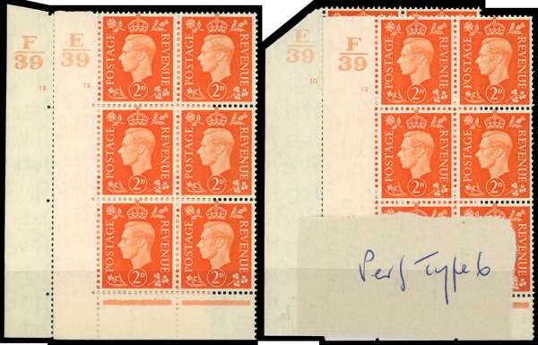 1938-51 2d orange Cylinder blocks mint, generally hinged on one or two stamps at the top of each block. All different, 22 perf Type 5 and 4 Type 6. Includes C38 Cyl. 1 dot and H40 Cyl. 14 dot. Condition a bit mixed. SG 465, £960.