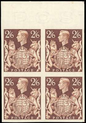 1939-48 2s6d brown upper marginal imperforate imprimatur block of four, unmounted o.g. with NPM handstamp on reverse. SG 476var.