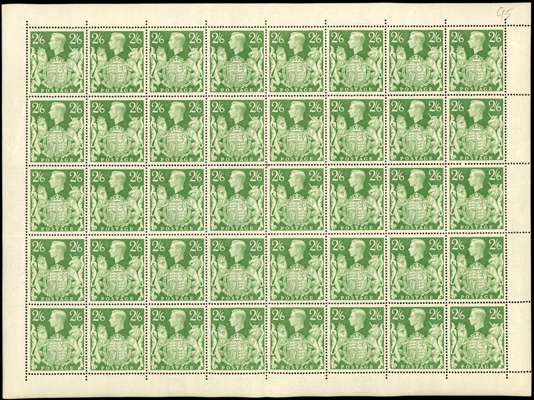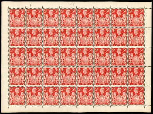 1939-48 2s6d green, 5s and £1 sheets of forty, some vertical folds otherwise chiefly fine. The 5s with R.1/1 single ‘T’ on jawline, and R.1/2 double ‘T’ on jawline. Unmounted o.g. SG 476b, 477, 478c.