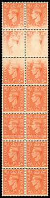 1941 2d pale orange 2 x 7 block o.g., hinged on top and bottom pairs only; showing substantial underinking on the top block of six and spotty, patchy printing on the block below. Minor foxed spots on reverse, still a spectacular block. SG 488 var
