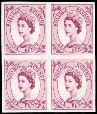 1955 6d reddish purple, imperforate imprimatur in block of four, with NPM h/s on reverse, mint unmounted o.g. very rare. SG 548var