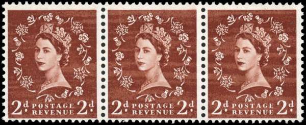 1958 2d Red brown "Dollis Hill Phosphor Trial". Very fine perforated horizontal strip of three on gummed crowns watermarked (Sideways to left) paper, with all over green phosphor showing a strong phosphor reaction. Scarce. Spec. ST4(3)b.