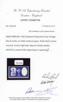 1962 National Productivity Year 3d with light blue (Queen's head), mint unmounted o.g. A stunning example of this extremely visual and desirable GB error. BPA Certificate (2015). SG 632a cat £2750