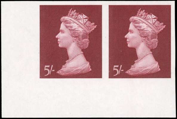 1969 5s crimson-lake Machin lower left corner imperforate imprimatur pair, mint unmounted o.g. with BPMA handstamp on reverse, fine and scarce. SG 788