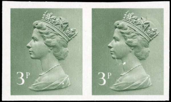 GB 1973 3p Harrison Colour Trial Proof imperforate pair in olive-grey